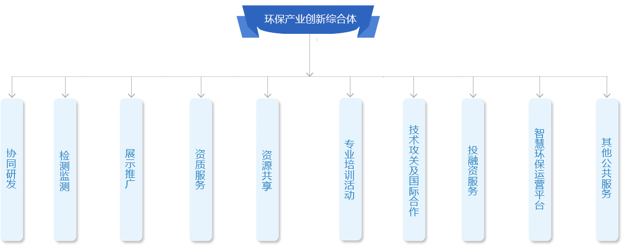 中電環(huán)保發(fā)揮行業(yè)龍頭作用,聯(lián)合“政產(chǎn)學研金才”綜合資源,打造“環(huán)保產(chǎn)業(yè)創(chuàng)新綜合體”,包括:“二區(qū)、三聯(lián)盟、三中心、七功能”。